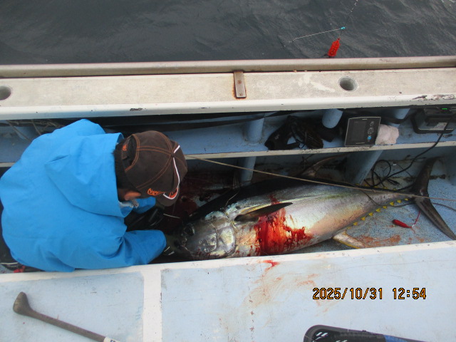 相模湾中央に出ました 前半カツオぽつぽつ釣れましたマグロ周りに来ますが本船の群れは食いが悪いが周りの船はマグロ食いが良いみたいです後半に釣り人6人でマグロ2本釣れました、当たりの良い船はマグロ10回くらい当ててました。